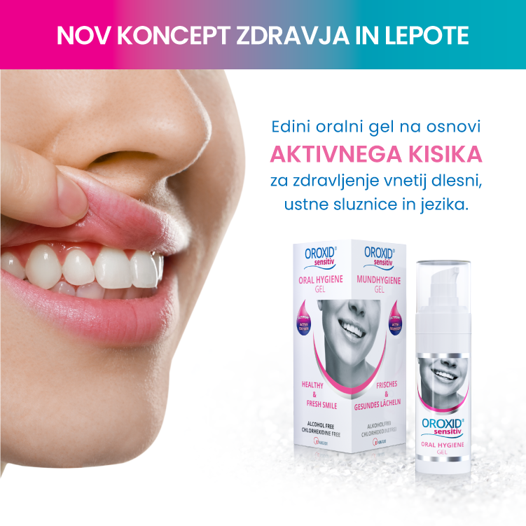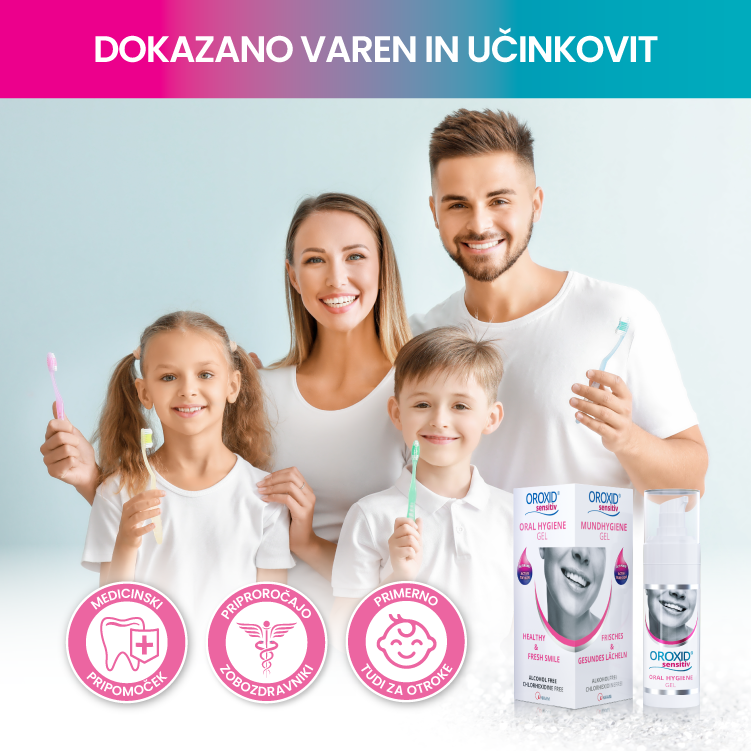 OROXID® sensitiv oralni gel je patentirani medicinski pripomoček na osnovi aktivnega kisika za lokalno uporabo v ustni votlini. Namenjen je lajšanju in preprečevanju vnetnih stanjih v ustni votlini (sluznica, dlesni, jezik in ustnice) pri otrocih in posameznikih z občutljivo ustno sluznico (bolniki po kemoterapiji, s kroničnimi boleznimi…). Inovativna struktura gela omogoča močnejši učinek in dolgotrajnejše delovanje aktivnega kisika na mestu nanosa.