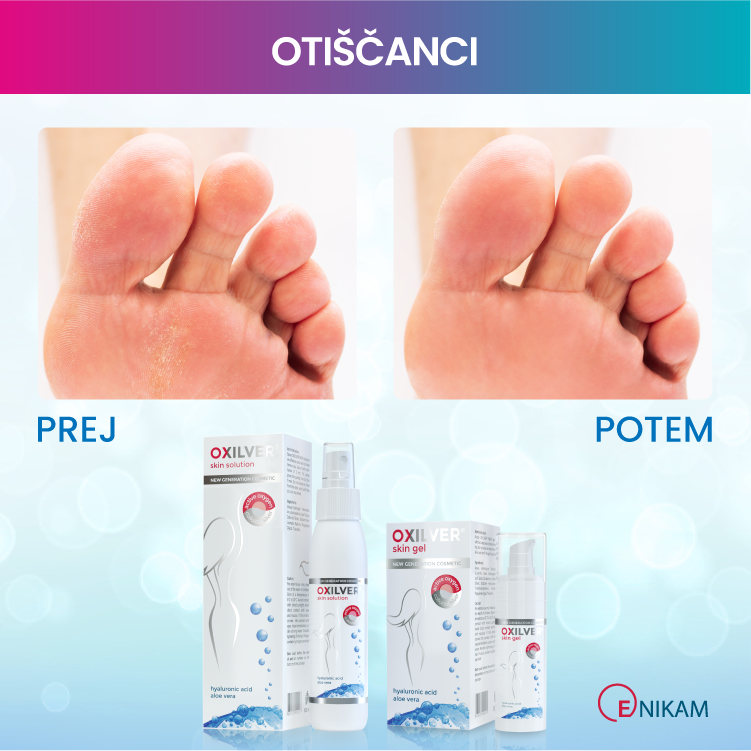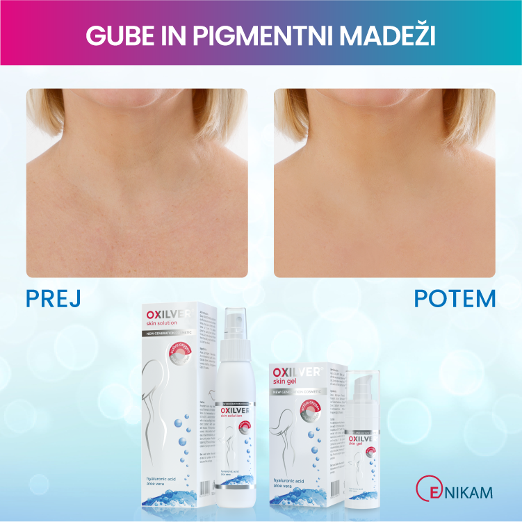 - Na problematične predele kože v tankem sloju nanesemo OXILVER® Skin gel, s čimer podaljšamo delovanje aktivnega kisika, čiščenje, hidracijo in nego.